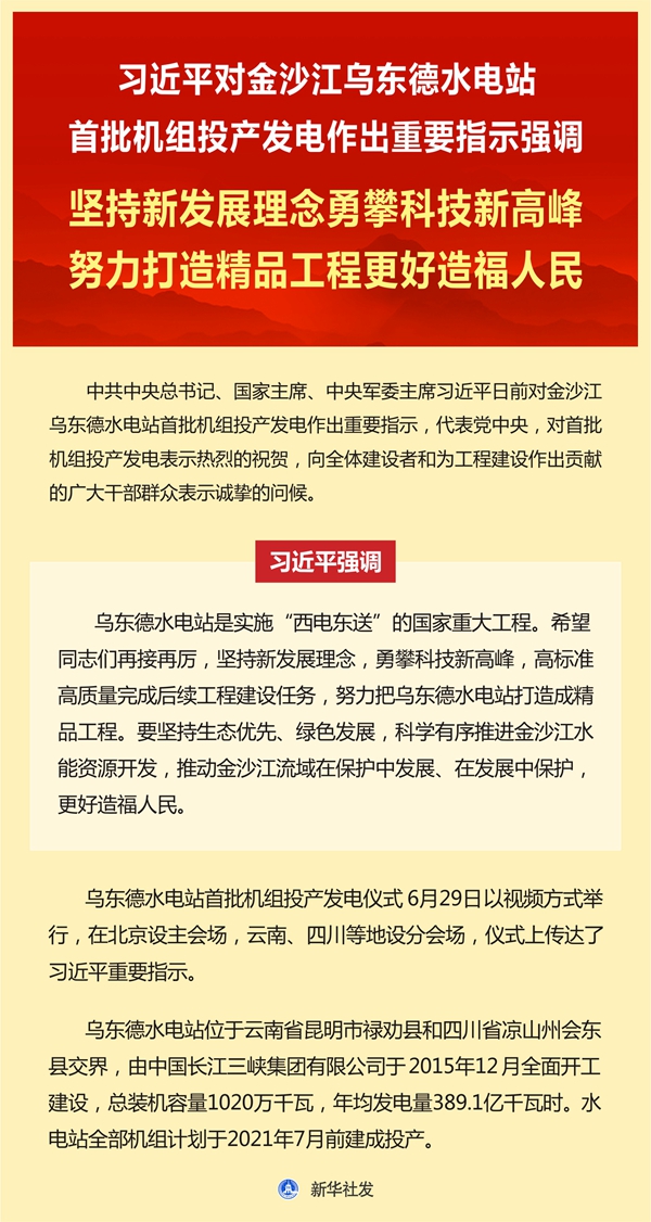 新華社北京6月29日電  中共中央總書記、國家主席、中央軍委主席習近平日前對金沙江烏東德水電站首批機組投產發電作出重要指示,代表黨中央,對首批機組投產發電表示熱烈的祝賀,向全體建設者和為工程建設作出貢獻的廣大干部群眾表示誠摯的問候。
