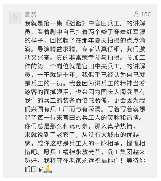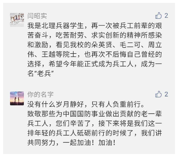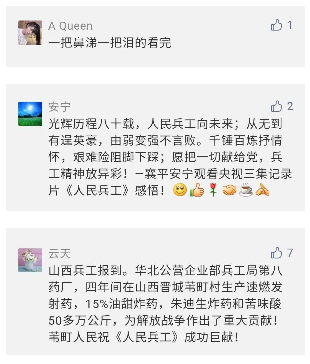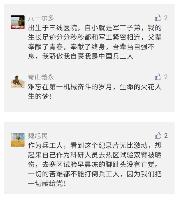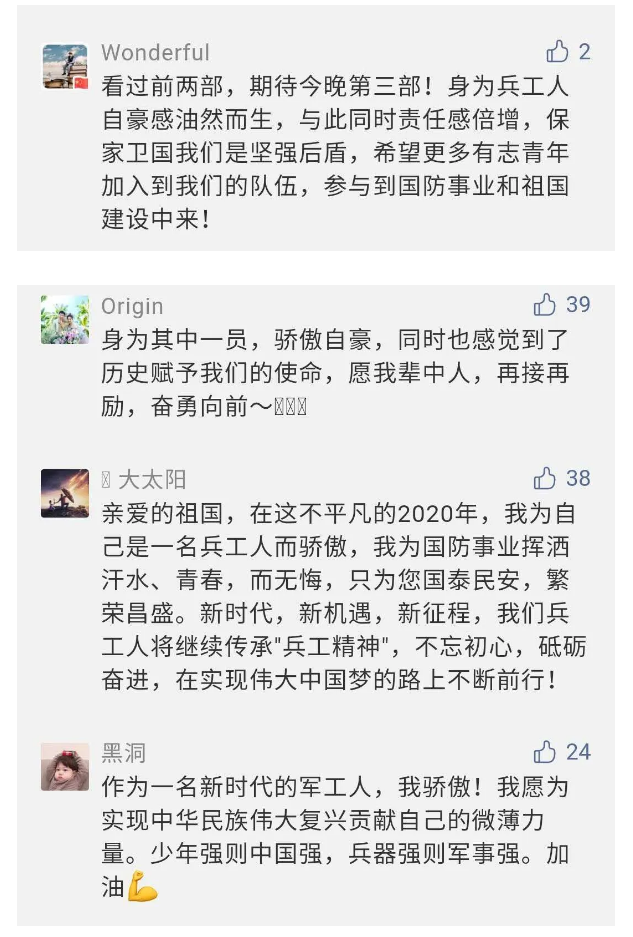 觀眾在兵器工業集團官微的留言區直抒了觀影感受,有的熱淚盈眶,有的心潮起伏,有的興起賦詩,有的認為讓心靈得到凈化、思想得以提升,有的認為是最直觀的國防教育教材......