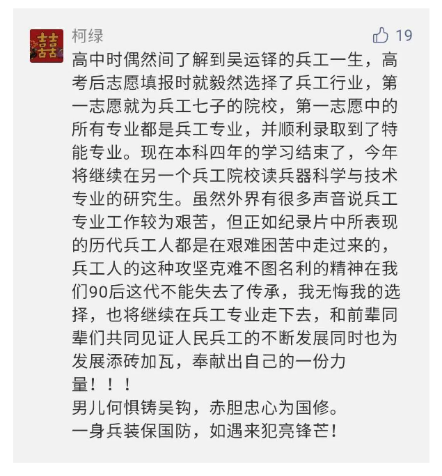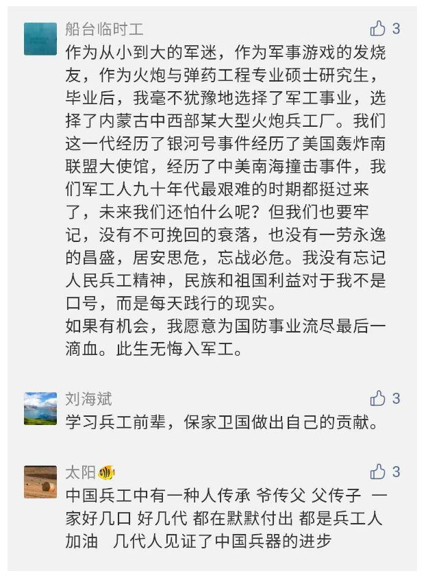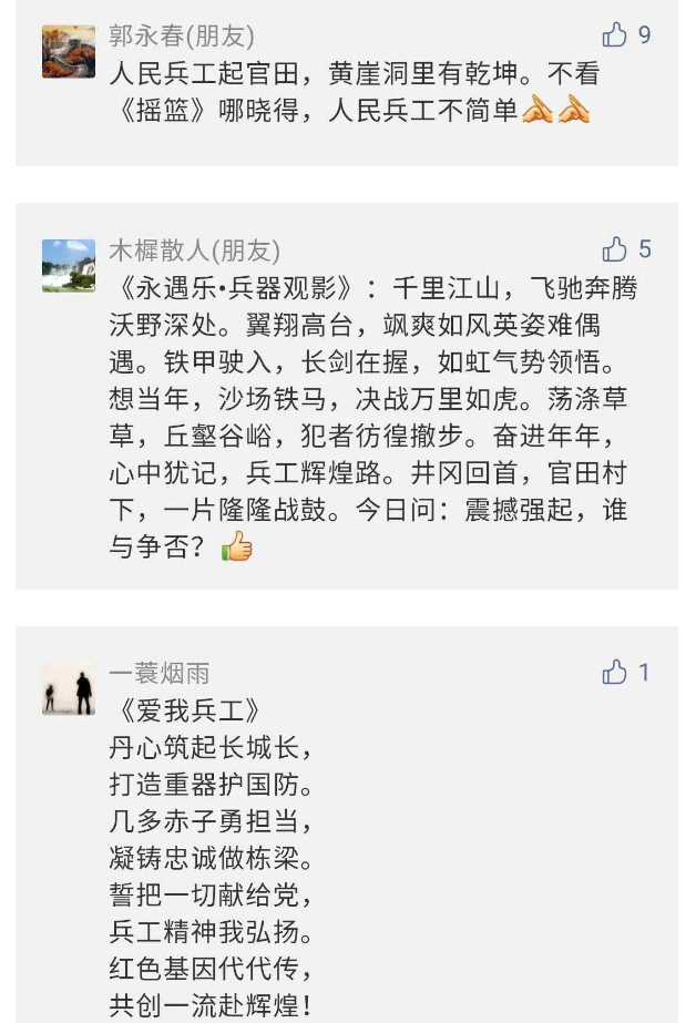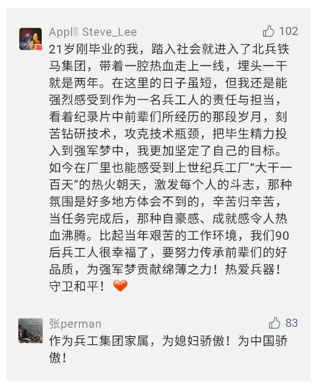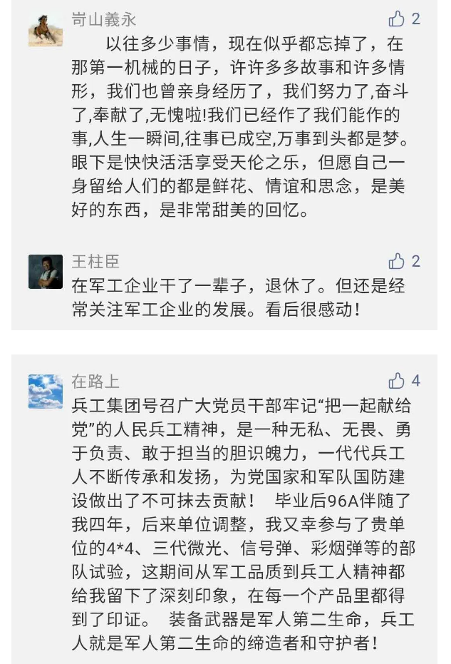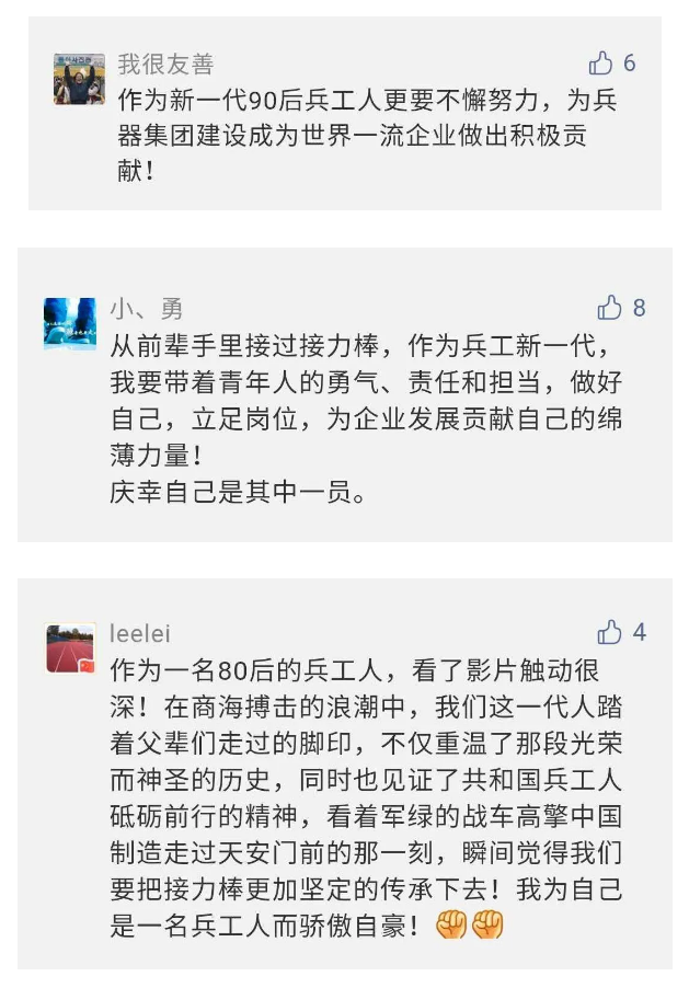 相比老一輩,年a輕的兵工人也表達了傳承紅色基因,弘揚新時代“把一切獻給黨”的人民兵工精神的豪邁氣概......