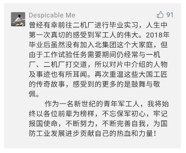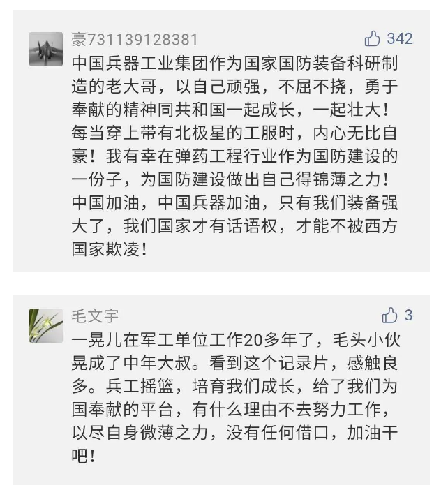 作為新時代弘揚人民兵工精神的特色文化成果,紀錄片的播出,凝聚起廣大兵器干部職工團結奮斗新時代磅礴力量,極大的增強了兵工人的自豪感,大家紛紛表達了作為軍工央企一員 “此生無悔入軍工”的使命擔當......