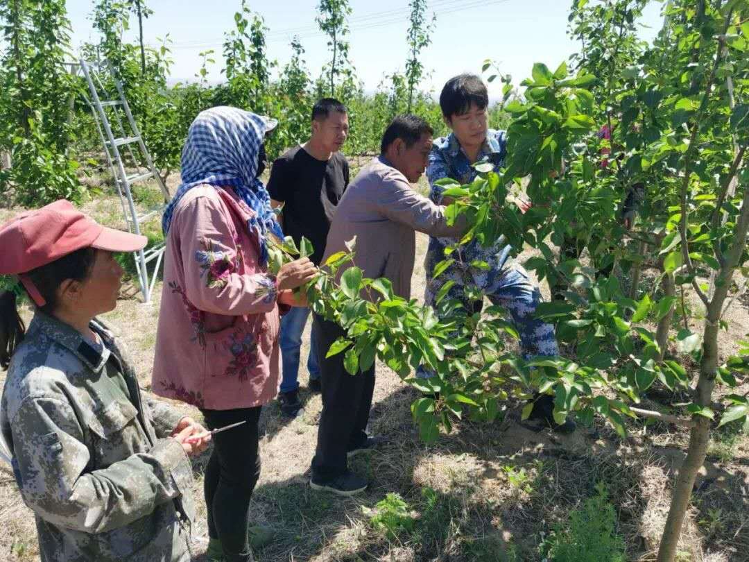 王躍(右一)指導村集體經(jīng)濟果園工人稀果