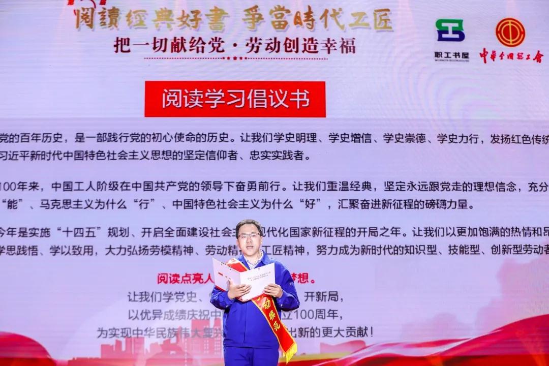 全國勞動模范、兵器工業集團北方車輛集團職工馬小光宣讀參加“把一切獻給黨·勞動創造幸福”全國職工黨史學習教育讀書活動倡議書