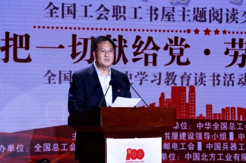 4月23日是第26個世界讀書日。在中華全國總工會指導下,全國工會職工書屋建設領導小組和中國兵器工業集團有限公司共同舉辦了第五屆“閱讀經典好書 爭當時代工匠”全國工會職工書屋主題閱讀交流活動暨“把一切獻給黨·勞動創造幸福”全國職工黨史學習教育讀書活動啟動儀式。中華全國總工會黨組書記、副主席、書記處第一書記陳剛出席活動并講話,中國兵器工業集團有限公司黨組書記、董事長焦開河致辭。陳剛向焦開河傳授活動火炬。全國總工會黨組成員、經費審查委員會主任、全國工會職工書屋建設領導小組組長李曉鐘,全國總工會兼職副主席高鳳林,中國兵器工業集團有限公司黨組副書記周艦出席活動。