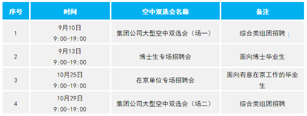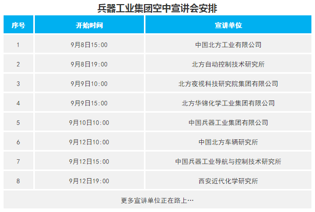 期間我們將組織兵器工業集團下屬單位開展空中專場雙選會,參加各大高校的空中招聘會,敬請期待!