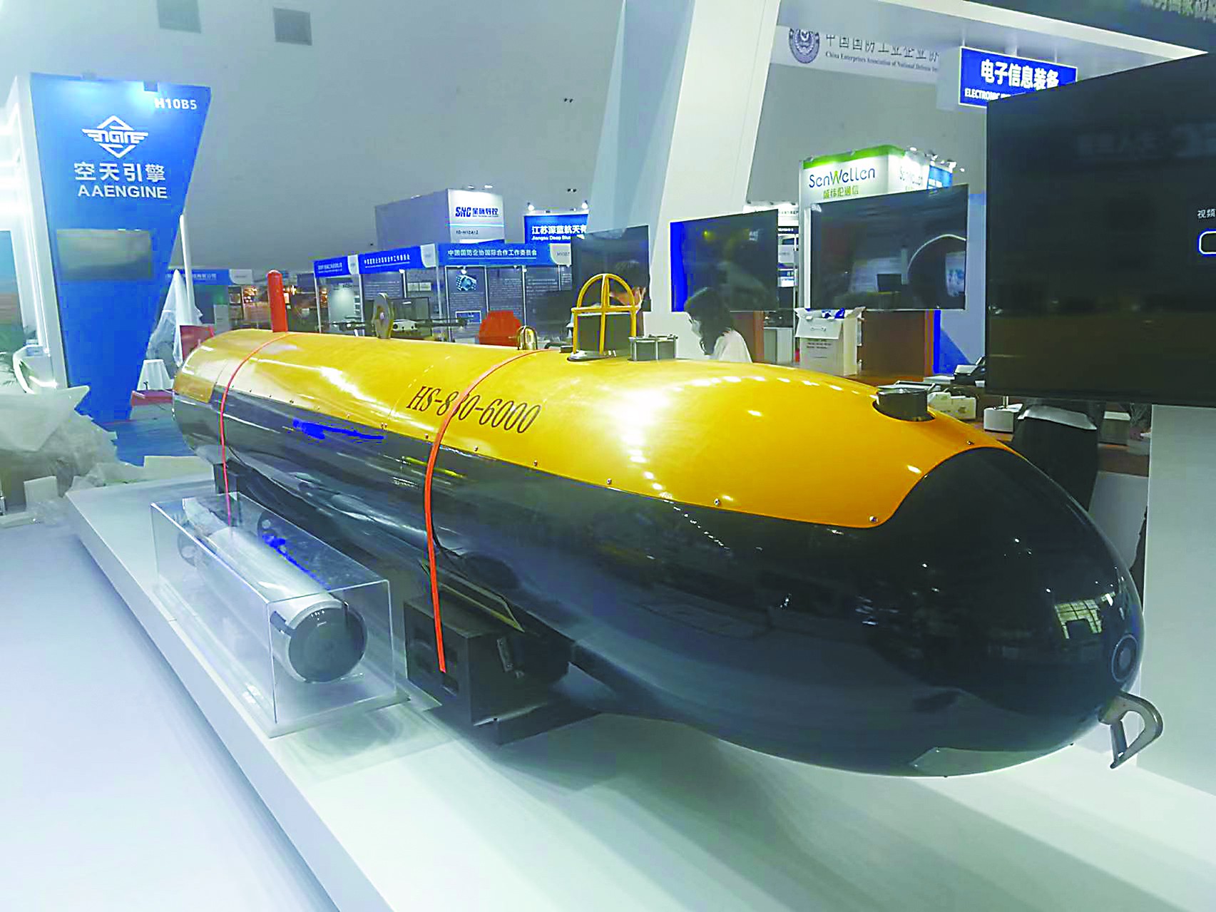 相比公眾相對熟悉的無人機和無人車,無人船和無人潛航器的知名度略低,但本屆珠海航展上展出的相關(guān)裝備具備相當高的水平。例如HS-880-6000型自主式水下航行器(AUV)就是國內(nèi)首型搜救型無人潛航器。它的最大工作深度達6000米,能以3節(jié)的速度連續(xù)航行24小時,配備有深水遇險目標高分辨低照度照明系統(tǒng)、聲信標定向引導聲吶、水聲探測側(cè)掃聲吶等,具備工作水深范圍寬、載荷能力大、續(xù)航力長、搜尋探測能力強等特點,可對深海目標全自主精細搜尋、探測、定位,執(zhí)行深海水下目標搜尋探測和海洋科學研究任務(wù)。另一款“守望者”無人潛航器個頭小巧,配備有光學探頭、戰(zhàn)斗部和通信設(shè)備,可以自動靠近水中或海底目標進行觀測、毀傷目標,用于執(zhí)行反水雷、排障、海底管道巡檢等任務(wù)。