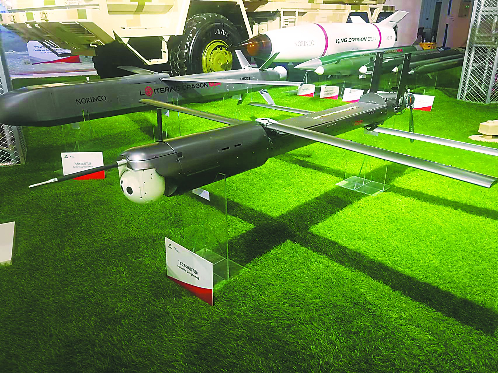 兵器工業(yè)集團展出的SR-5遠程火箭炮系統(tǒng)被稱為“中國版‘海馬斯’”,它的特點之一就是能共架發(fā)射“飛龍-60”巡飛彈,從而引導火箭炮對數(shù)百公里外目標的遠程精確打擊。