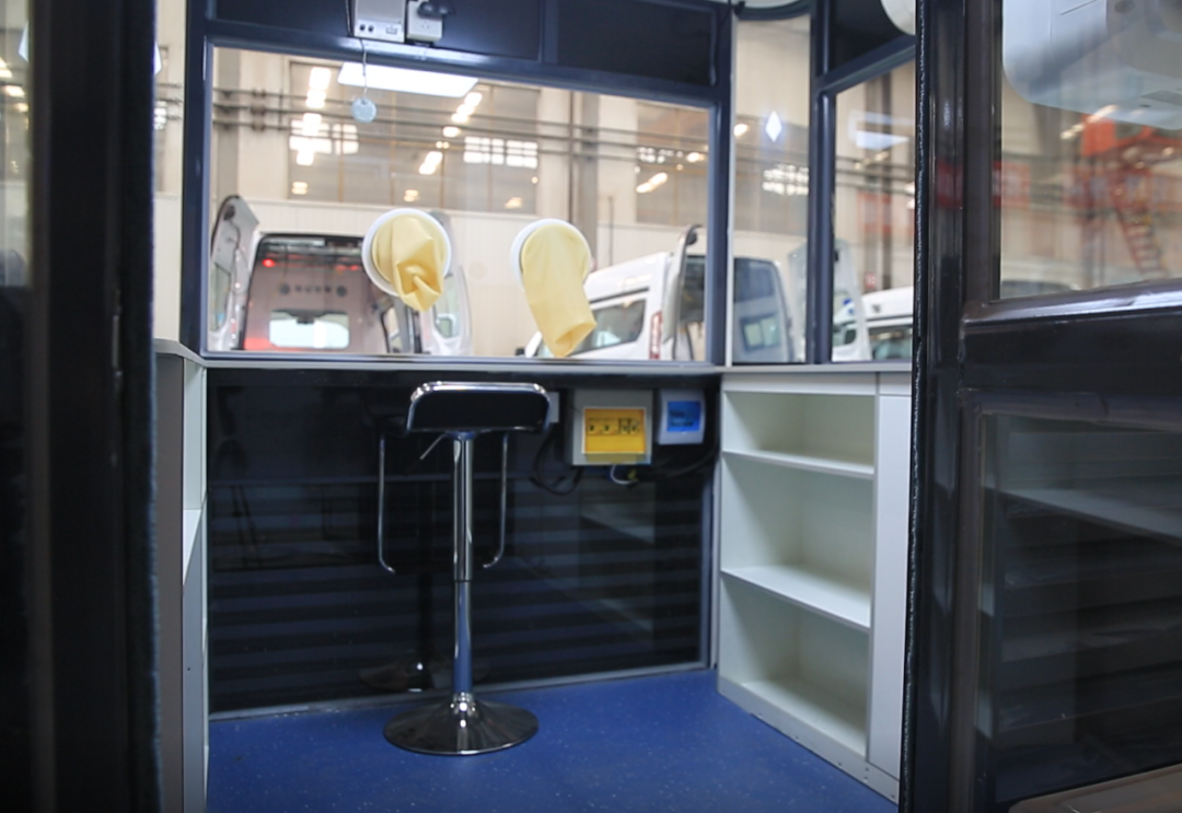 核酸采樣車采用福特新全順中軸中頂汽油款底盤,外觀與普通救護車類似,內部上裝醫療輔助系統、空調系統、照明系統、新風過濾系統等。其中,最為核心的醫療輔助系統包括采樣窗口、隔離手套、車載冰箱、洗手池系統、凈水桶、污水箱、污物桶、車載飲水機等。