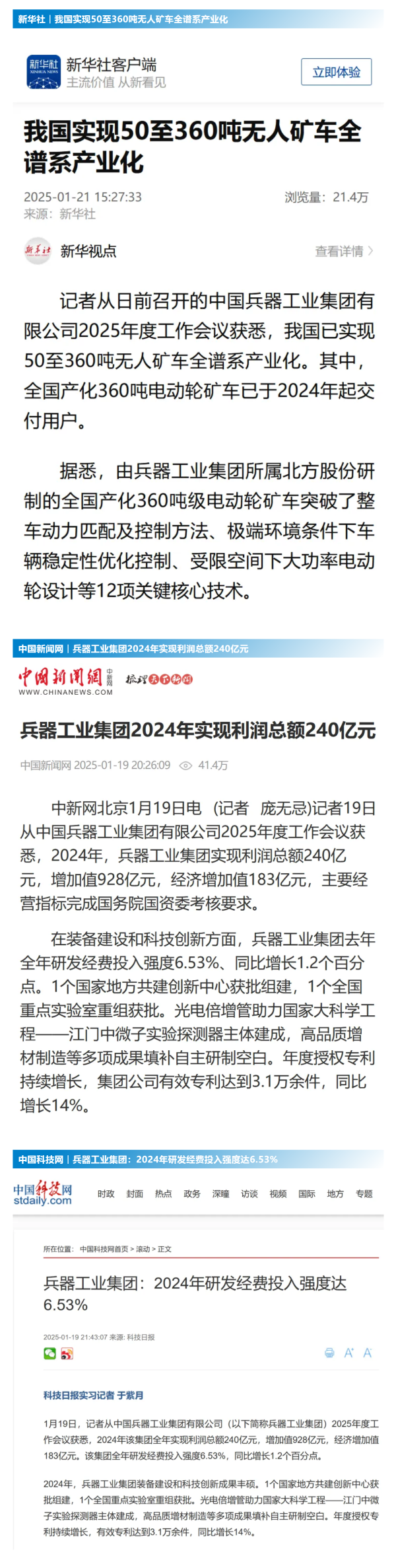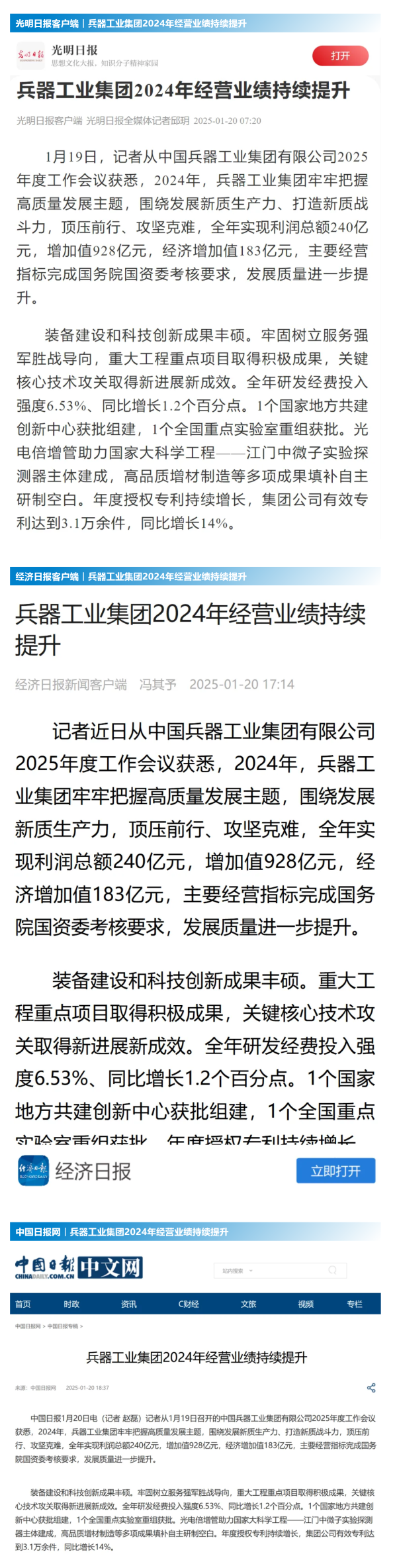 1月19日至20日,中國兵器工業(yè)集團有限公司2025年度工作會議在京召開,會議總結2024年工作,分析形勢任務,明確工作思路,部署2025年工作。 集團公司2024年取得的成績及下一步重點工作受到社會媒體廣泛關注。新華社、中國新聞網(wǎng)、中國科技網(wǎng)、光明日報客戶端、經(jīng)濟日報客戶端、中國日報網(wǎng)、國務院國資委網(wǎng)站、學習強國中央企業(yè)學習平臺、新浪網(wǎng)、網(wǎng)易網(wǎng)、搜狐網(wǎng)、騰訊網(wǎng)、鳳凰網(wǎng)等中央主流媒體、國家部委網(wǎng)站及知名網(wǎng)絡媒體對集團公司2025年度工作會議進行了報道,重點關注集團公司經(jīng)營業(yè)績、科技創(chuàng)新、產(chǎn)業(yè)結構布局優(yōu)化等情況。其中,新華社以《我國實現(xiàn)50至360噸無人礦車全譜系產(chǎn)業(yè)化》為題,重點報道了集團公司在推動智能制造水平提升方面取得的成效;中國新聞網(wǎng)、光明日報客戶端、經(jīng)濟日報客戶端、中國日報網(wǎng)等就集團公司2024年度經(jīng)營業(yè)績及各項工作取得的成果進行報道;中國科技網(wǎng)著重報道了集團公司在科技創(chuàng)新和優(yōu)化產(chǎn)業(yè)結構布局方面的最新進展。集團公司門戶網(wǎng)站、微信公眾號、微博等新媒體平臺以及《中國兵工報》也對集團公司工作會議進行了及時報道,各成員單位紛紛對相關內(nèi)容進行轉載,引發(fā)全系統(tǒng)關注。 集團公司職工及廣大網(wǎng)友熱議工作會 “2025年工作會為我們指明了發(fā)展方向、明確了奮斗目標,面對全新的機遇和挑戰(zhàn),作為兵工人深感責任重大。” “科技是第一生產(chǎn)力,一定要以科技創(chuàng)新引領新質生產(chǎn)力發(fā)展,為高質量發(fā)展提供支撐。” “把各項工作做深、做實、做細,努力為集團公司高質量發(fā)展添磚加瓦。” “2024年中國兵器展示了大國重器,祝新的一年中再創(chuàng)輝煌!” |